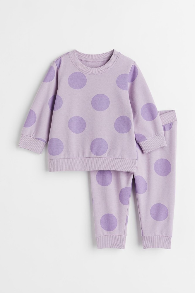 Set with a top and pair of trousers in lightweight cotton sweatshirt fabric. Top with a round neckline, two press-studs on one shoulder, one of which is concealed (no press-studs in sizes 2-4Y), and ribbing around the neckline, cuffs and hem. Trousers with elasticated ribbing at the waist and a ribbed trim at the hems.