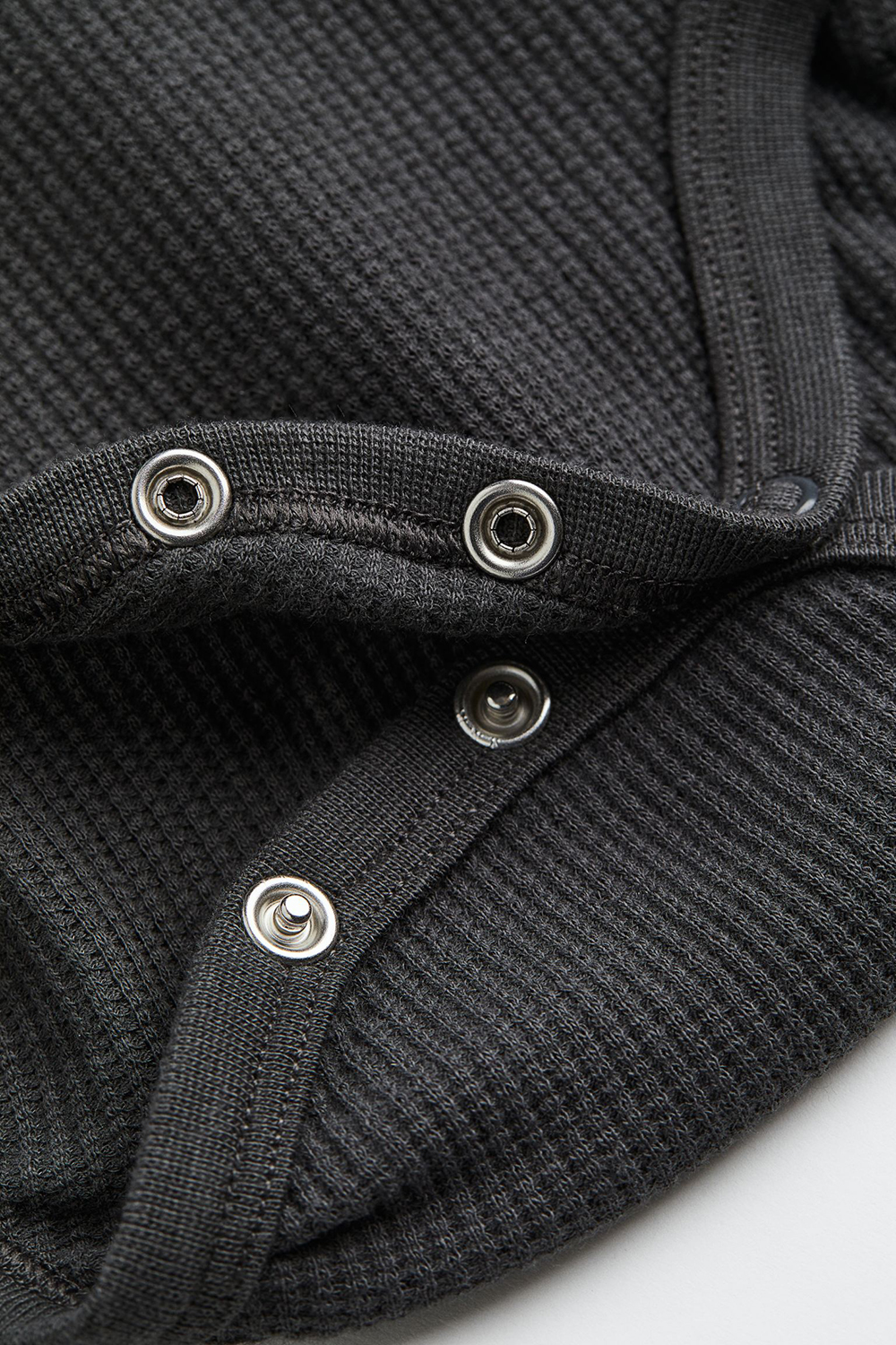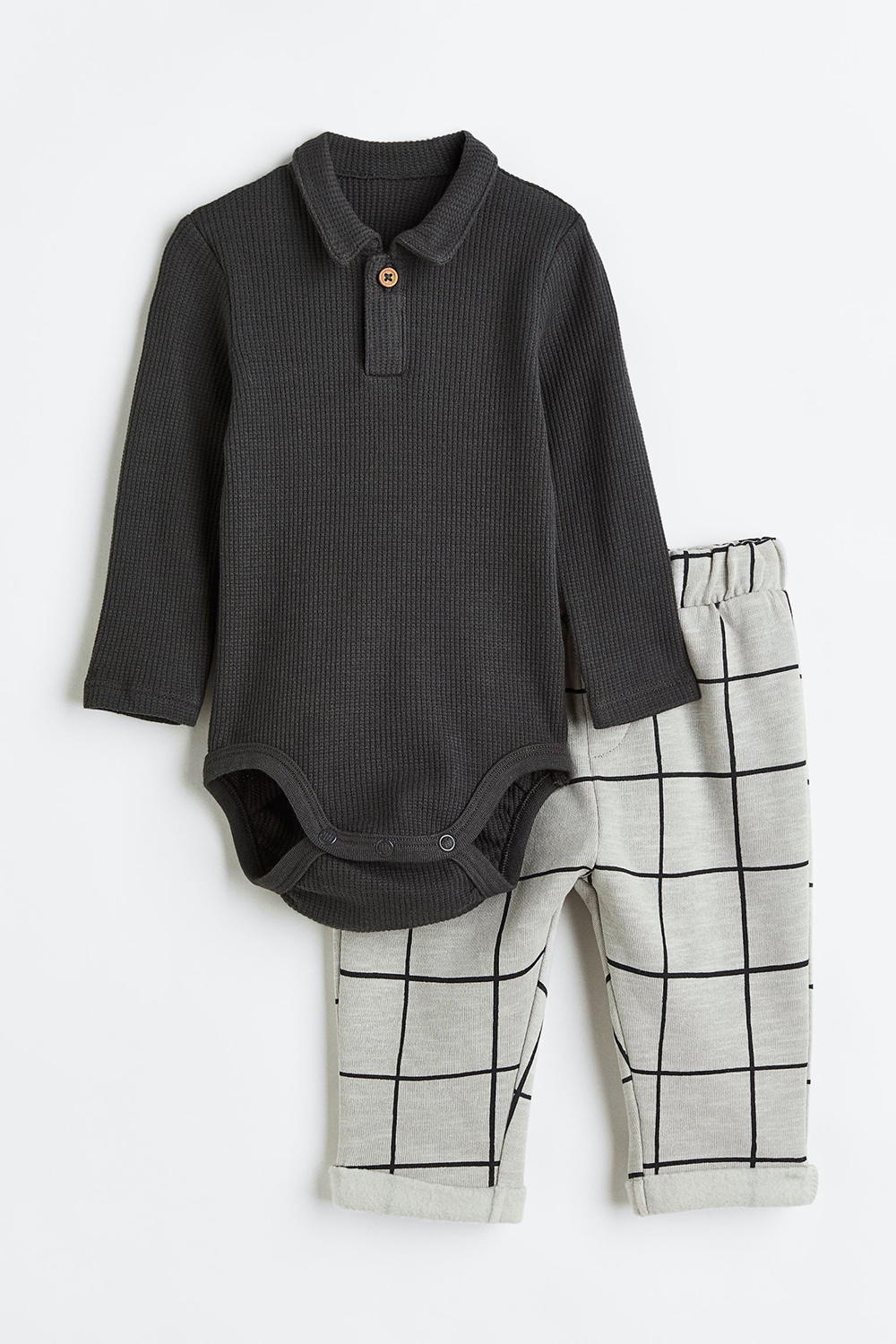 Set with a bodysuit in waffled cotton jersey and sweatpants with soft, brushed inside. Long-sleeved bodysuit with a collar, button at top, snap fasteners at gusset, and ribbed hems for a snug fit around diaper. Pants with an adjustable, elasticized waistband, mock fly, and sewn foldover cuffs.