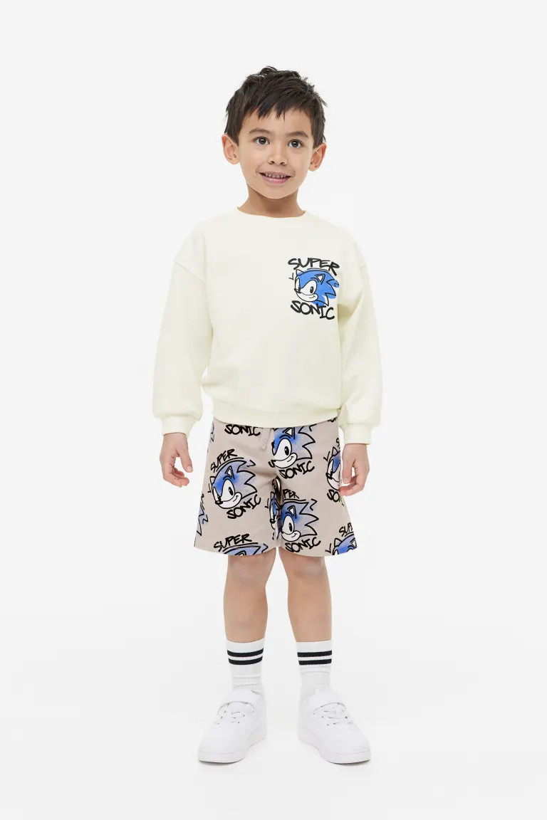 Printed set with a shirt and joggers in thick cotton jersey. Long-sleeved shirt with snap fasteners on one shoulder and ribbing at neck, cuffs, and hem. Joggers with an adjustable, elasticized waistband and ribbed hems.