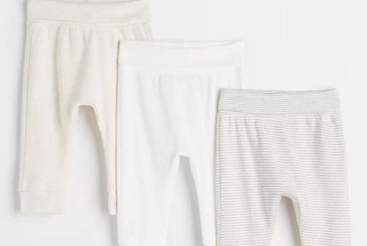 Set in soft cotton sweatshirt fabric. Top with off-center snap fasteners at front and long, raglan sleeves with ribbed cuffs. Pants with a wide, foldover section at waist and ribbed hems.