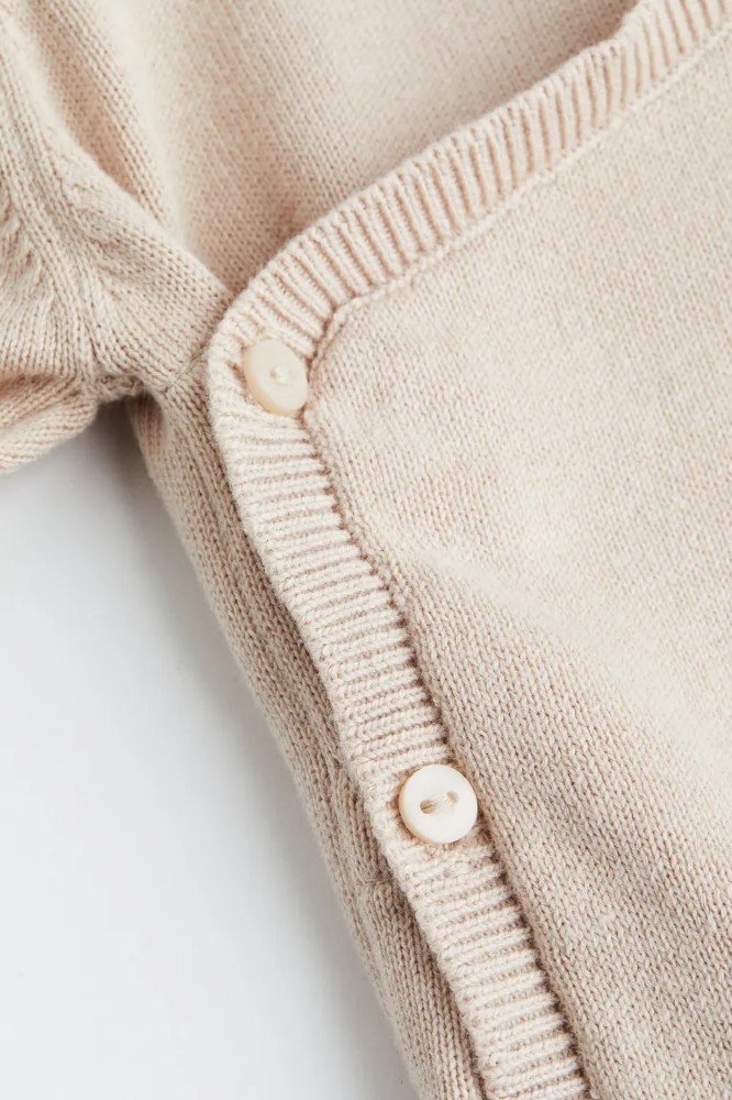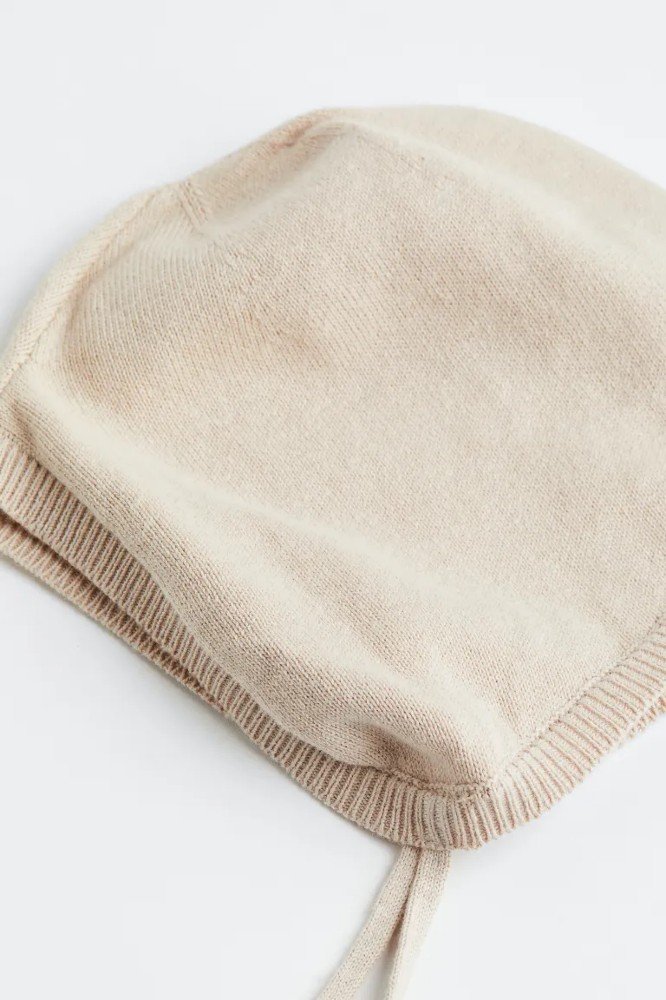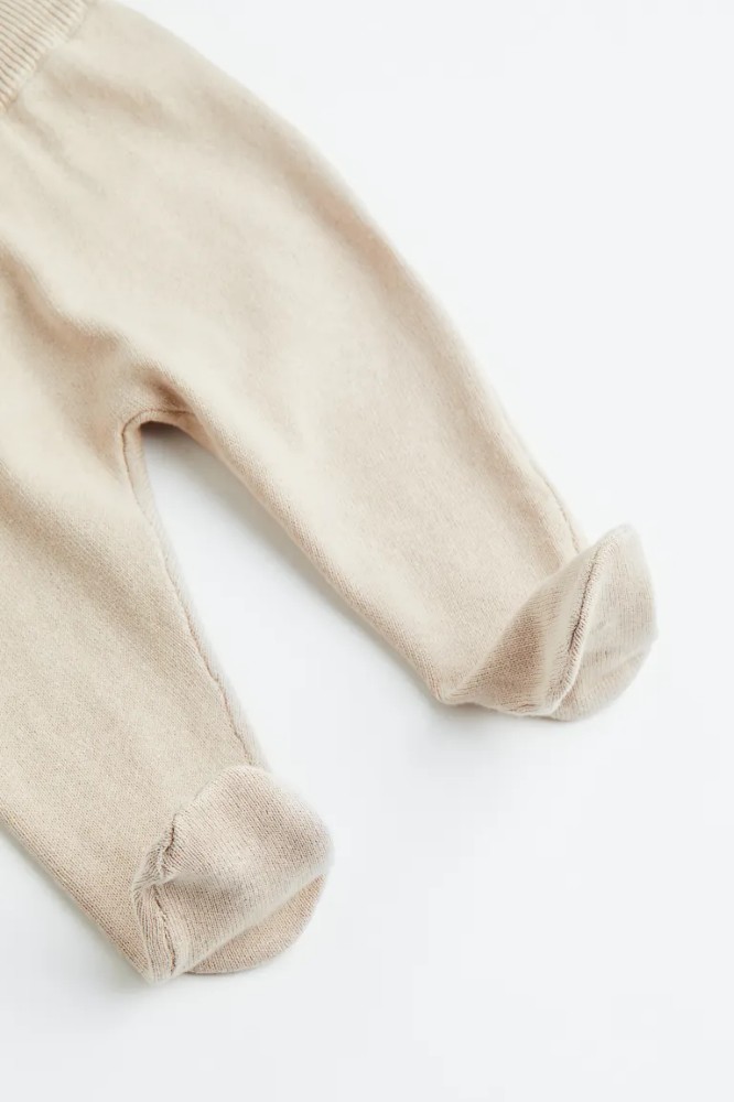 Comfy set with a jumper, pair of leggings and a hat in soft, fine-knit cotton. Long-sleeved jumper with a wrapover front and buttons at one side. Leggings with elasticated ribbing at the waist and full feet. Helmet hat with ties under the chin.