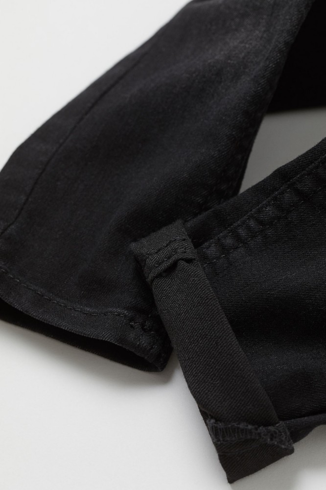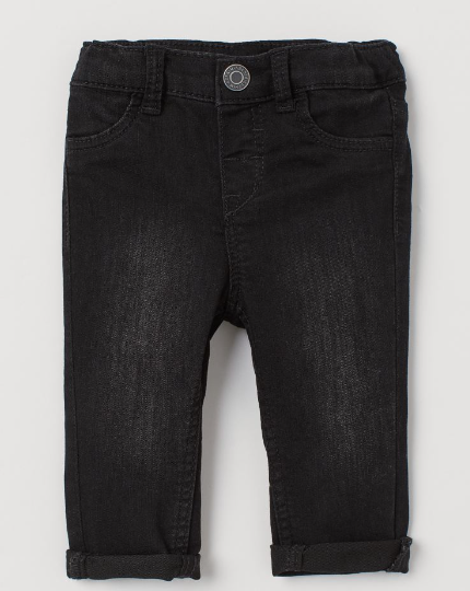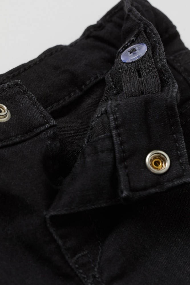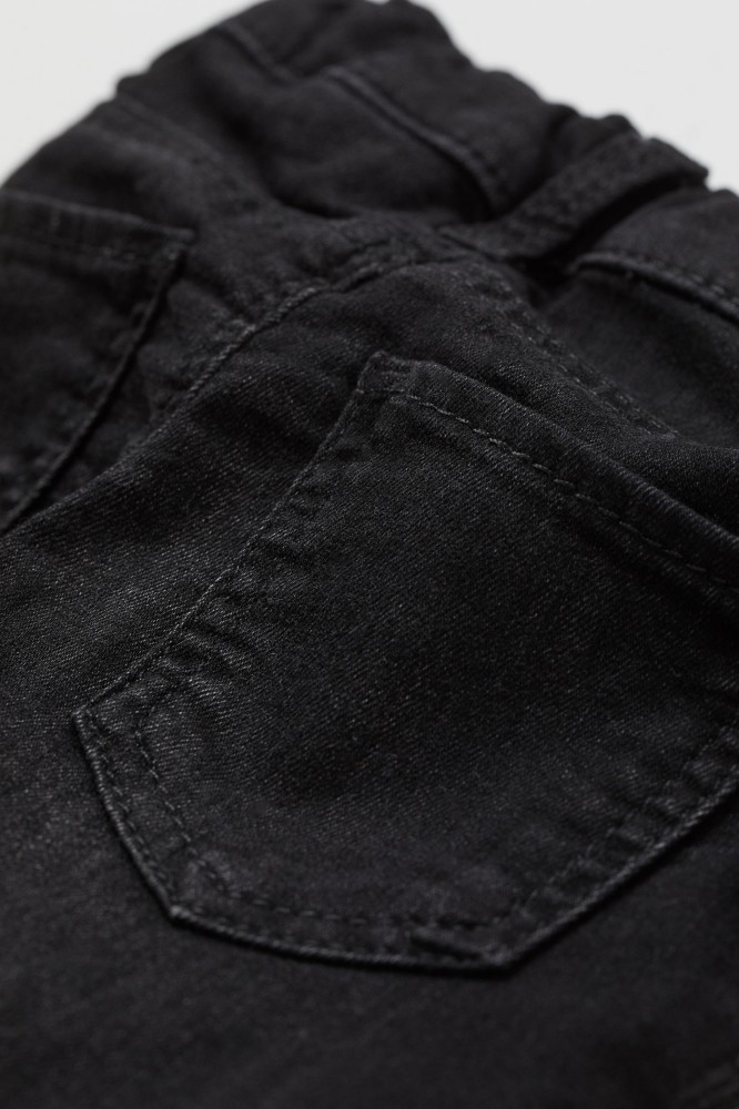 Jeans in washed, stretch denim with an adjustable, elasticated waist and fake fly with a press-stud. Fake front pockets, real back pockets and slim legs with narrow hems.