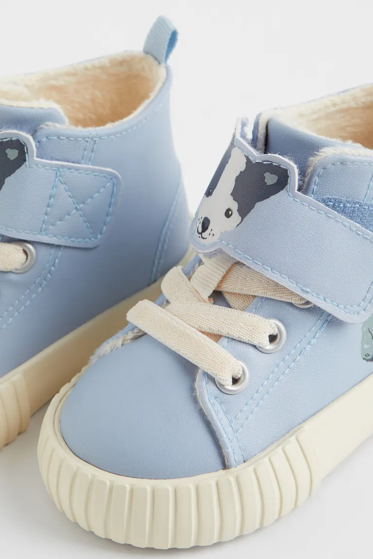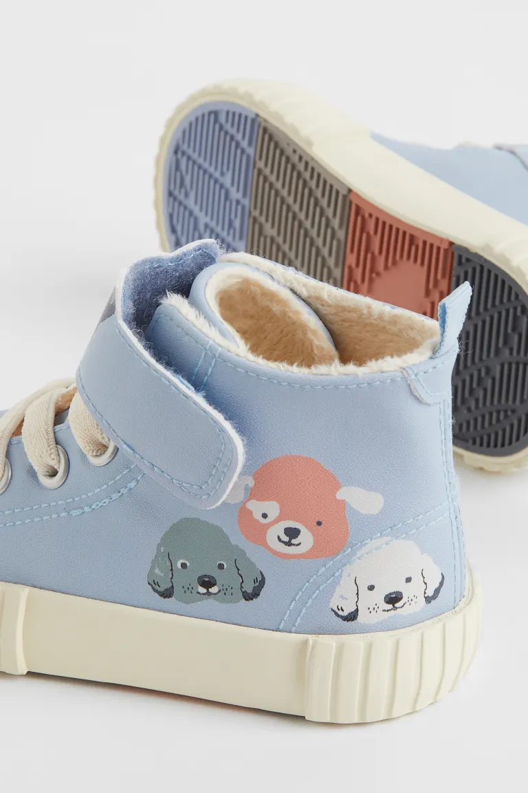High tops in faux leather with a printed motif. Elasticized lacing and hook-loop tab at front to get shoes on and off with ease. Loop at back. Lining and insoles in soft velour to keep feet warm and cozy. Patterned soles.