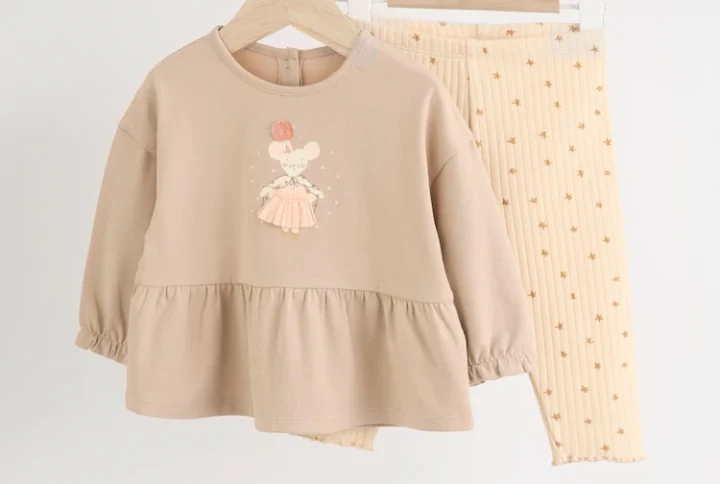 Long-sleeved dress in soft, patterned cotton jersey with press-studs on one shoulder and a seam and flounce at the hem