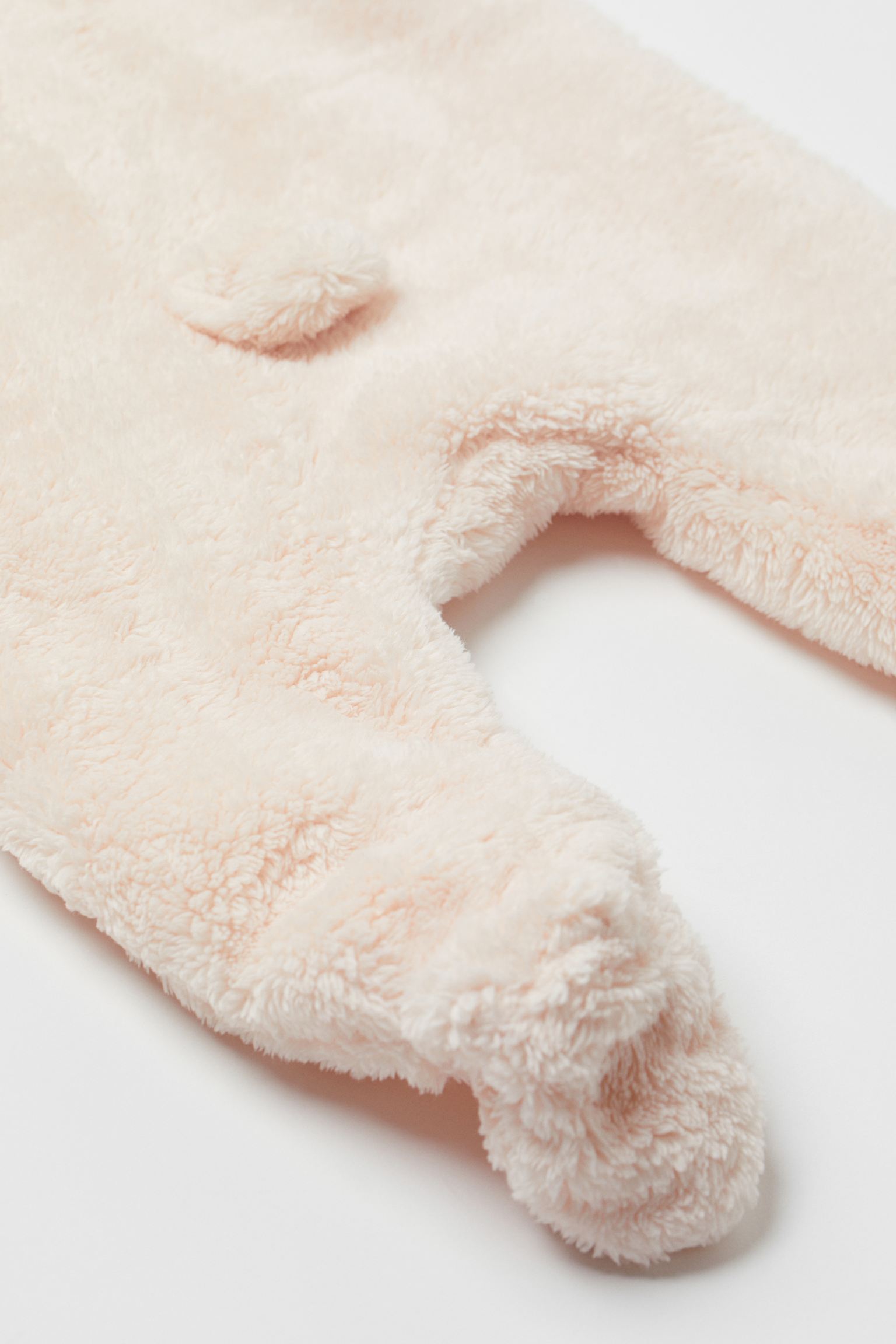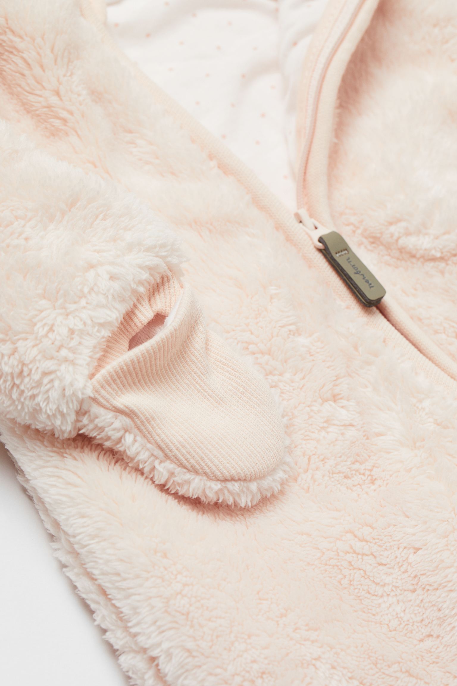 Overall in soft faux shearling. Hood with ears, zip at front extending down one leg, and chin guard at top. Foldover cuffs on sleeves to keep hands warm. Jersey lining.