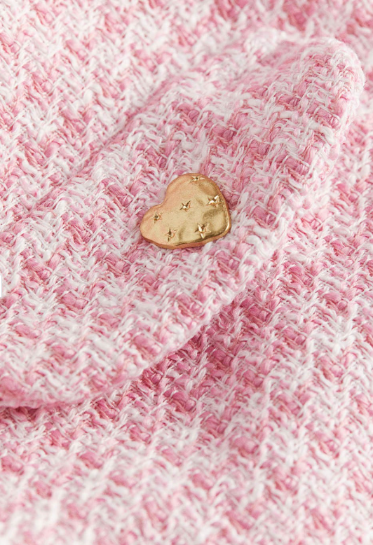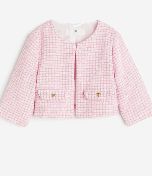 Jacket in a boucle weave with 3/4 length sleeves, fake front pockets with a flap and a round neckline with a concealed hook-and-eye fastening at the front. Lined.