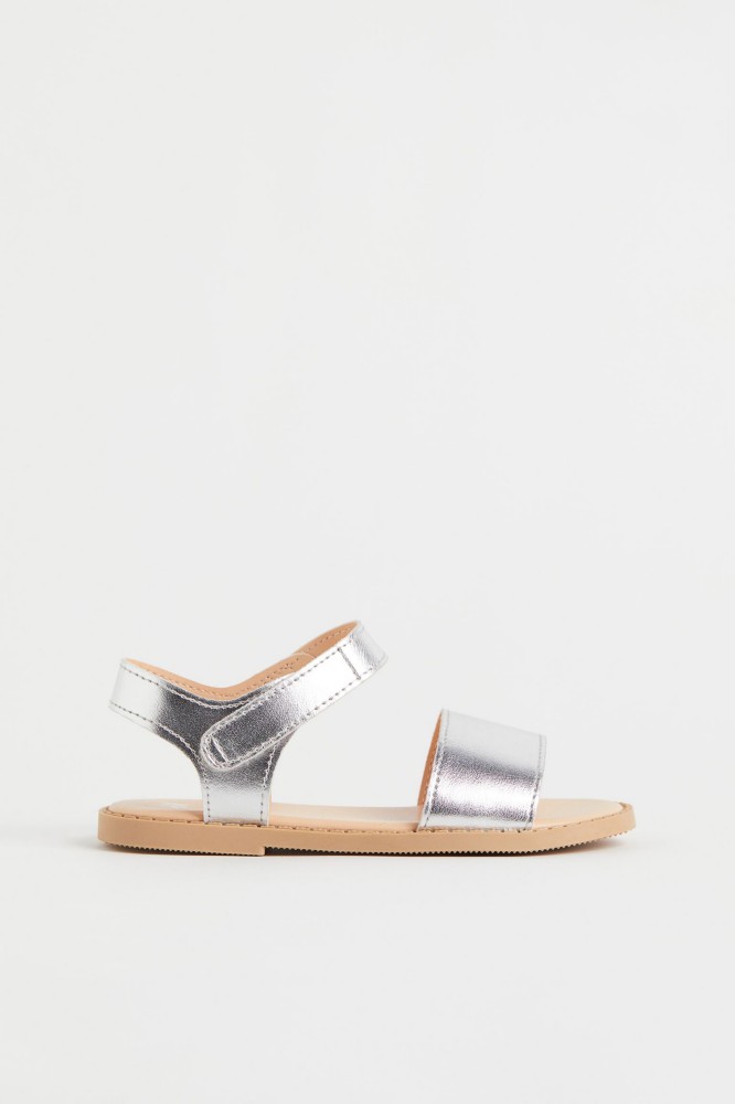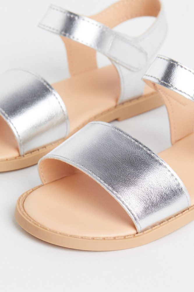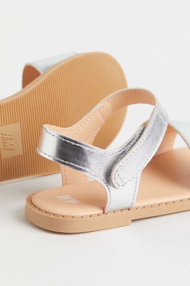 Sandals in imitation leather with crossover foot straps and an ankle strap with a hook and loop fastening. Imitation leather linings and insoles and fluted soles.