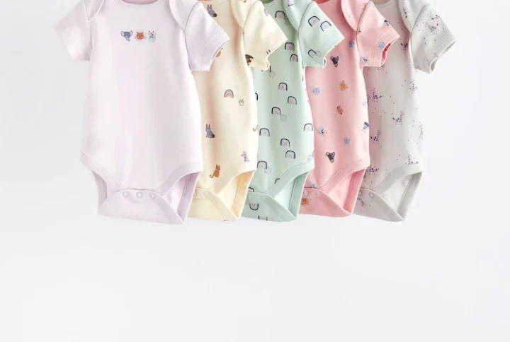 This 5-pack of baby bodysuits feature pink and purple hues, made from pure cotton with short sleeves, an envelope neck and a popper fastening to the crotch for easy changing. Perfect for keeping your little one’s everyday essentials well-stocked.