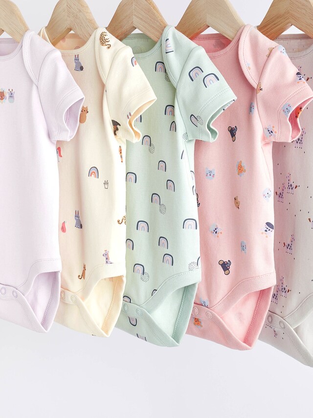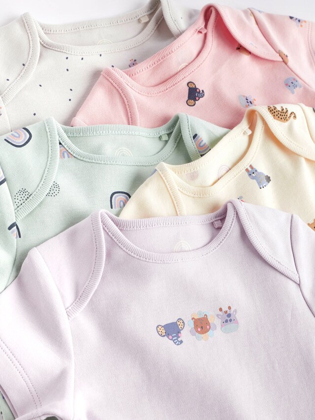 Our 5-pack baby short-sleeved bodysuits in pink/purple are the perfect choice for your little one.
